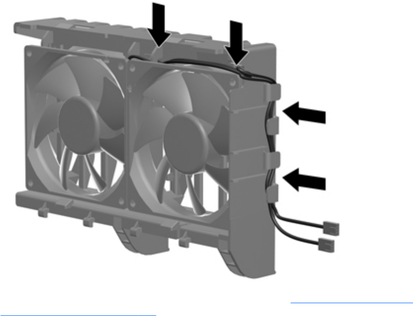 Guide the fan cable under the cable retention clamps as shown in the following figure.